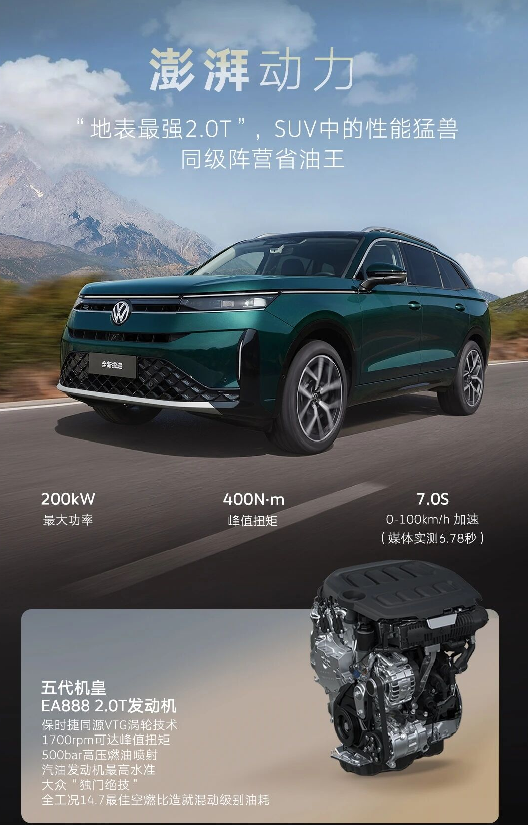 全新揽巡就跳出了这个怪圈,换装了大众最新的第五代EA888发动机,还加了可变截面涡轮增压技术。可能有人会问,这不还是EA888吗?能有什么不一样?这里要多说一句,第五代EA888可不是简单的升级,可变截面涡轮技术解决了传统涡轮迟滞的痛点,低转速时能快速驱动涡轮,起步不肉;高转速时又能稳定输出动力,后段不乏力。搭配DQ501变速箱,换挡平顺,几乎感觉不到顿挫,不管是市区通勤还是高速行驶,都能给你一种“收放自如”的驾控感。