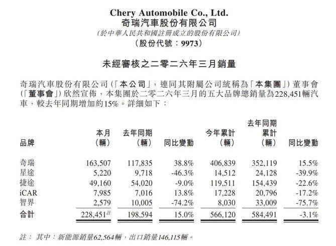 4月1日,奇瑞集团发布3月份销量快报,数据显示,3月销量达到228451辆,同比去年同期198594辆增长15%,2026年第一季度销量为566120辆,同比下滑3.1%。