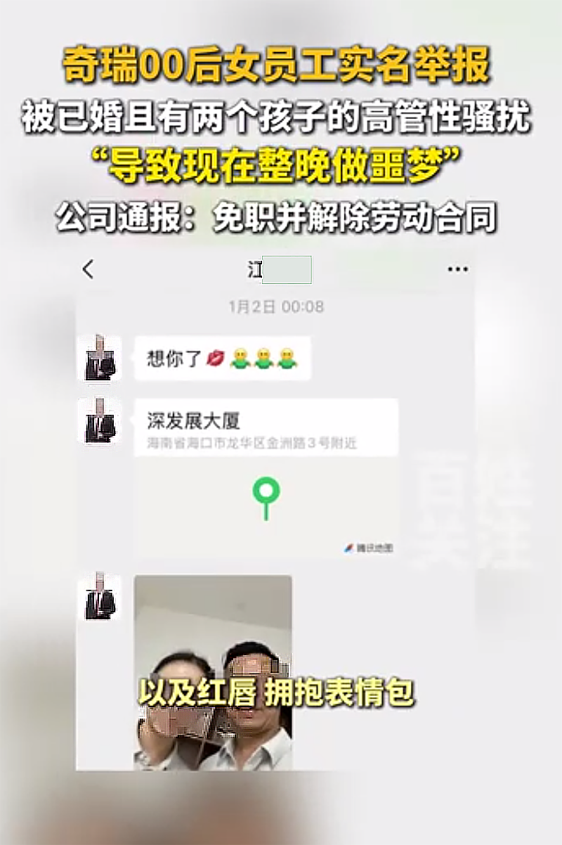 该公司一名00后女员工实名举报奇瑞商用车生态事业部总经理、好用生态科技(安徽)有限公司总经理、芜湖市好用汽车租赁有限公司总经理江文波职场性骚扰,该司于3月28日收到实名举报,后第一时间成立专项调查组展开核查,经核实相关情况之后,已于3月31日对涉事管理人员做出免职处罚,并解除劳动合同。