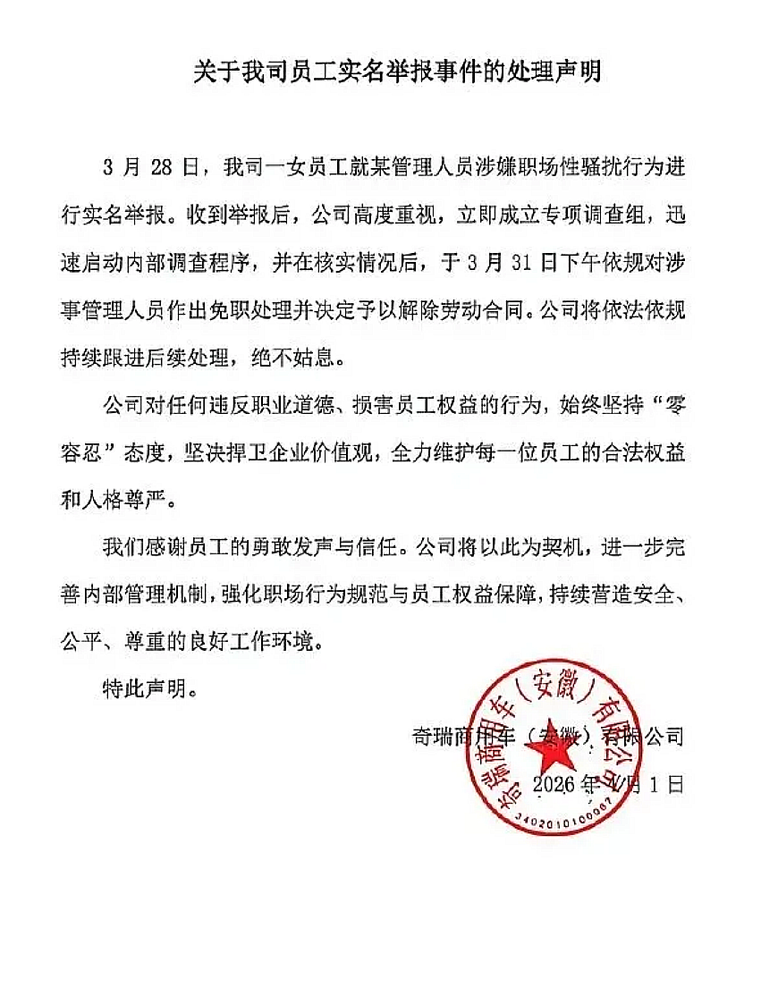 奇瑞商用车方面表示将依法依规持续跟进后续处置,对侵害员工权益、违反职业道德的行为坚持零容忍,坚决维护员工合法权益和人格尊严。