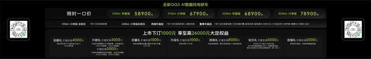 3月30日,“王者归来 一部到位”全新QQ3上市发布会在成都露天音乐公园盛大举行,一代“国民神车”在智电时代越级焕新,推出310km、420km两种续航版本共四款车型,官方上市价5.89万元起。此前车型已取得盲订订单超6万台、预售订单超4万台的傲人战绩。全新QQ3正式上市用“高颜值、大格局、强体魄、更懂你”的四大核心价值,诠释“一部到位”的快乐生活。