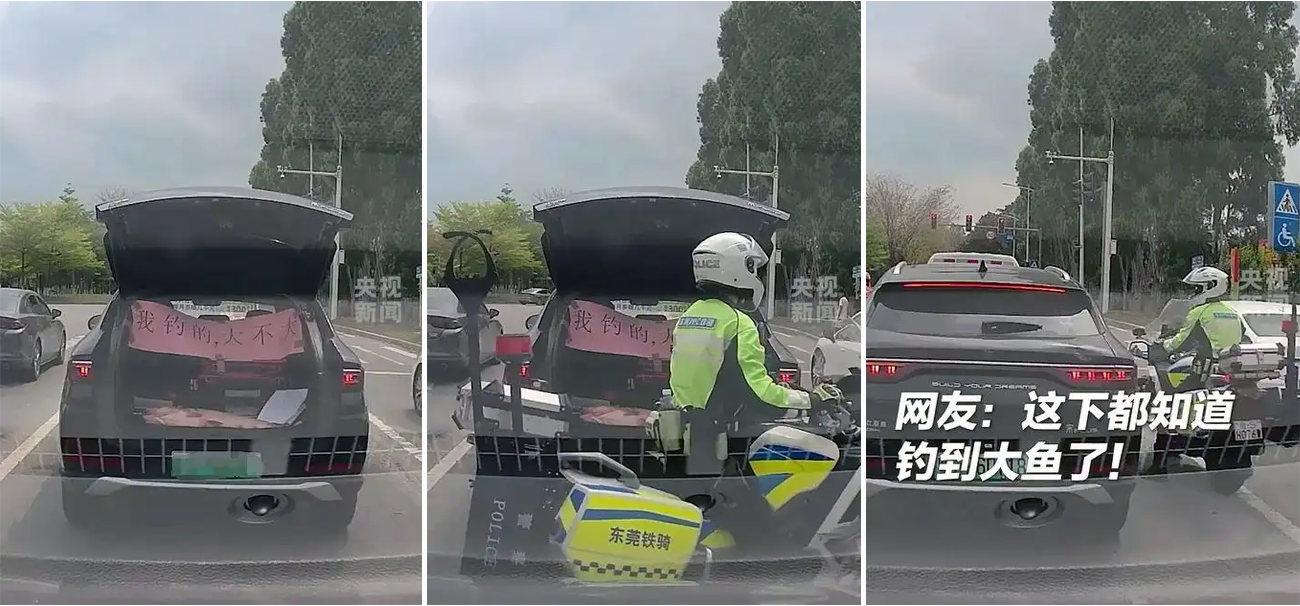 4月1日,广东东莞一辆汽车在行驶中忽然打开后备箱;在后备箱里躺着一条近一米长的大鱼,车厢里还拉着横幅,内容为“我钓的,大不大。”