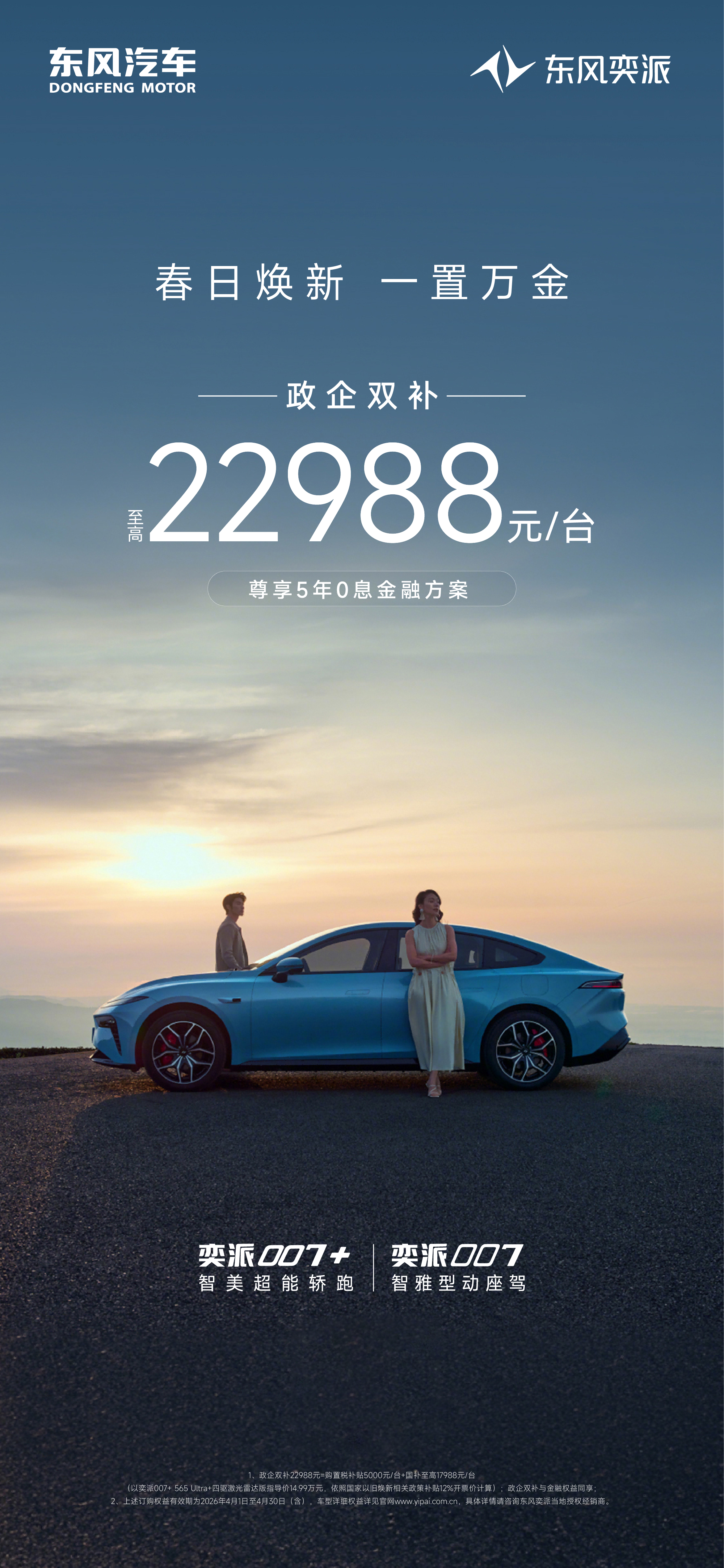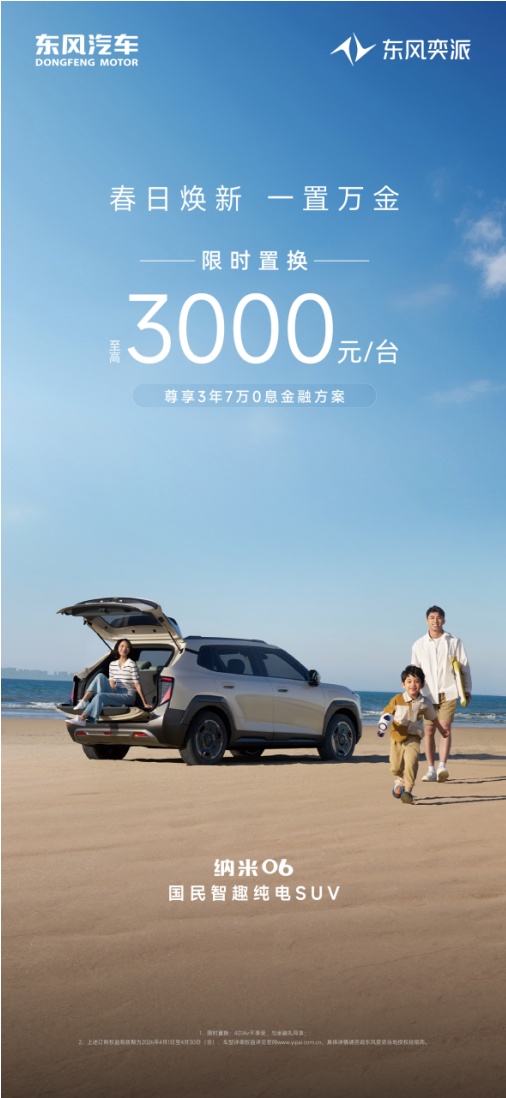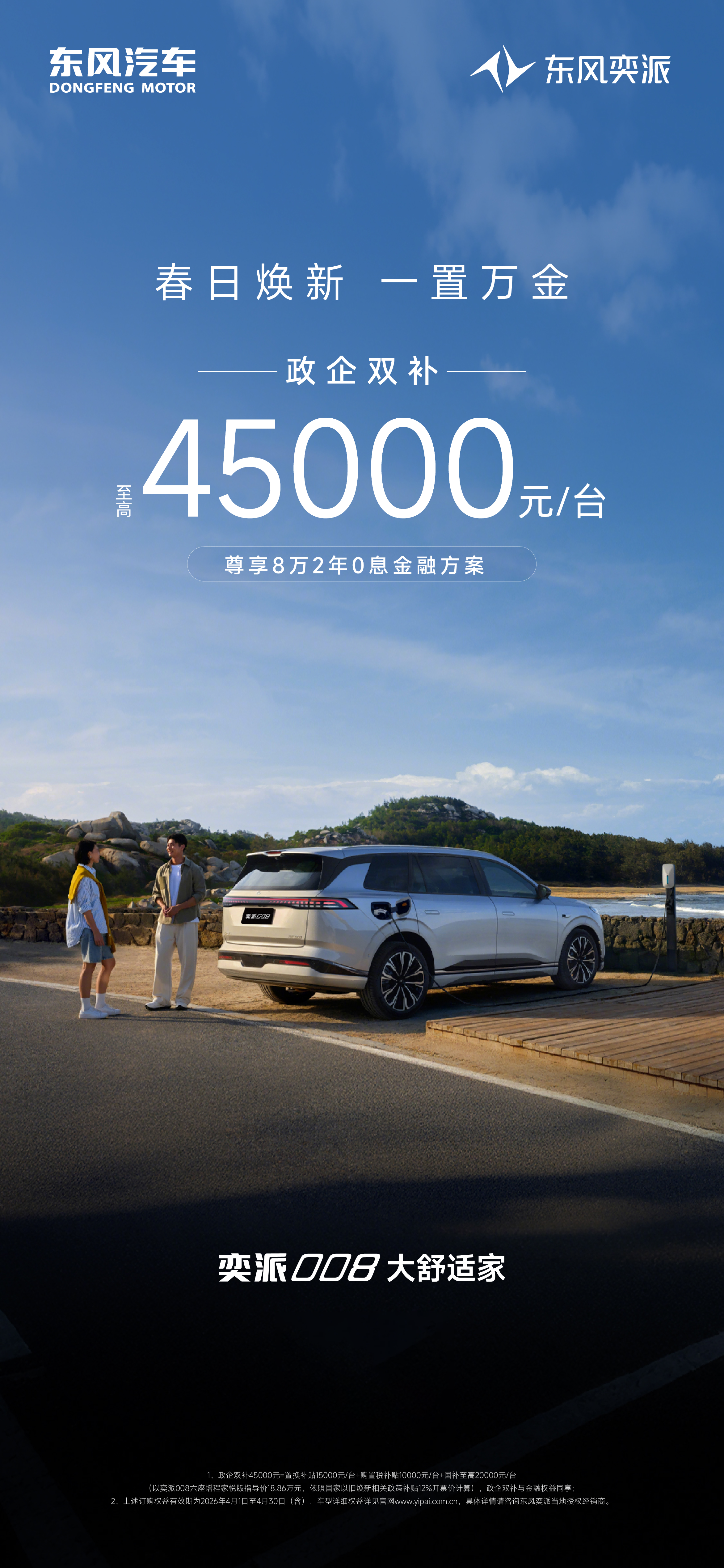 春日焕新,一置万金。从销量稳步增长到购车权益持续加码,东风奕派正以扎实的产品力与切实的用户回馈,陪伴更多消费者开启高品质出行生活。购车正当时,东风奕派诚邀广大消费者莅临全国经销商门店,亲身体验各款车型的开“新”实力,趁春日好时光,想省钱就现在!