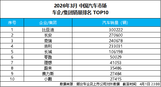 4 月 1 日,比亚迪发布 2026 年 3 月产销数据,单月总销量达300222 辆,强势突破 30 万辆大关,斩获中国车企销量冠军,并连续 58 个月蝉联中国新能源汽车销量冠军,持续稳固行业龙头地位。截至目前,比亚迪新能源汽车累计销量已超1580 万辆,一季度累计销售 700463 辆,以硬核数据印证技术与规模双重实力,助力一季度完美收官。