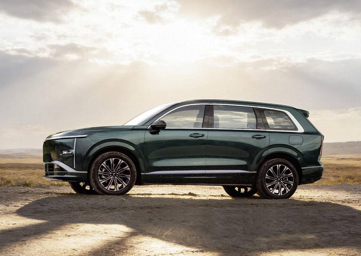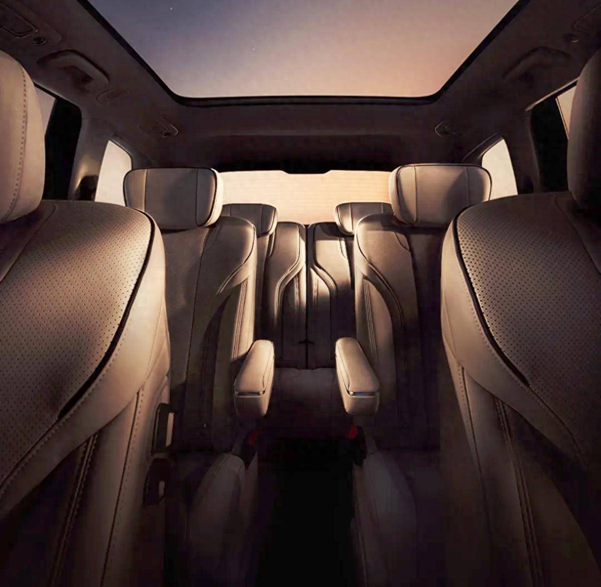从内饰图来看,新车采用的是2+2+2座椅布局,座椅使用了打孔皮质,还使用了深色缝边装饰,副驾座椅带有老板按键。第二排是两个独立式座椅,内侧带有扶手,头枕带有侧翼支撑造型,第三排座椅靠背能够5/5比例折叠,头枕也带有侧翼支撑造型。车顶带有全景天窗。