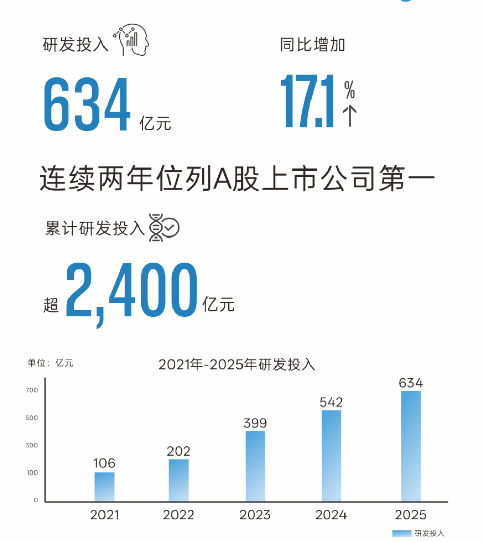 如果说销量和营收是比亚迪的“面子”,那么技术研发就是它的“里子”。2025年,在净利润下滑的情况下,比亚迪做了一个让所有人意外的决定,就是逆势加码研发。全年研发投入634亿元,同比增长17%,占营收比约7.9%,这个数字,不仅连续多年位列A股上市公司第一,更是超过了当年326.19亿元的归母净利润总额。