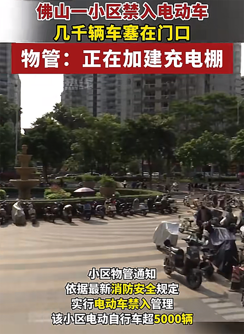 在该小区门口的露天广场上停放着大量的电动自行车,甚至连人行道旁的充电棚也已停满;业主称此前电动车一直停放在楼栋架空层或者疏散通道,直到3月21日,小区物业发布通知依据《广东省高层建筑消防安全管理规定》的要求,小区将实行电动车禁入管理,于是才有以下这一幕。
