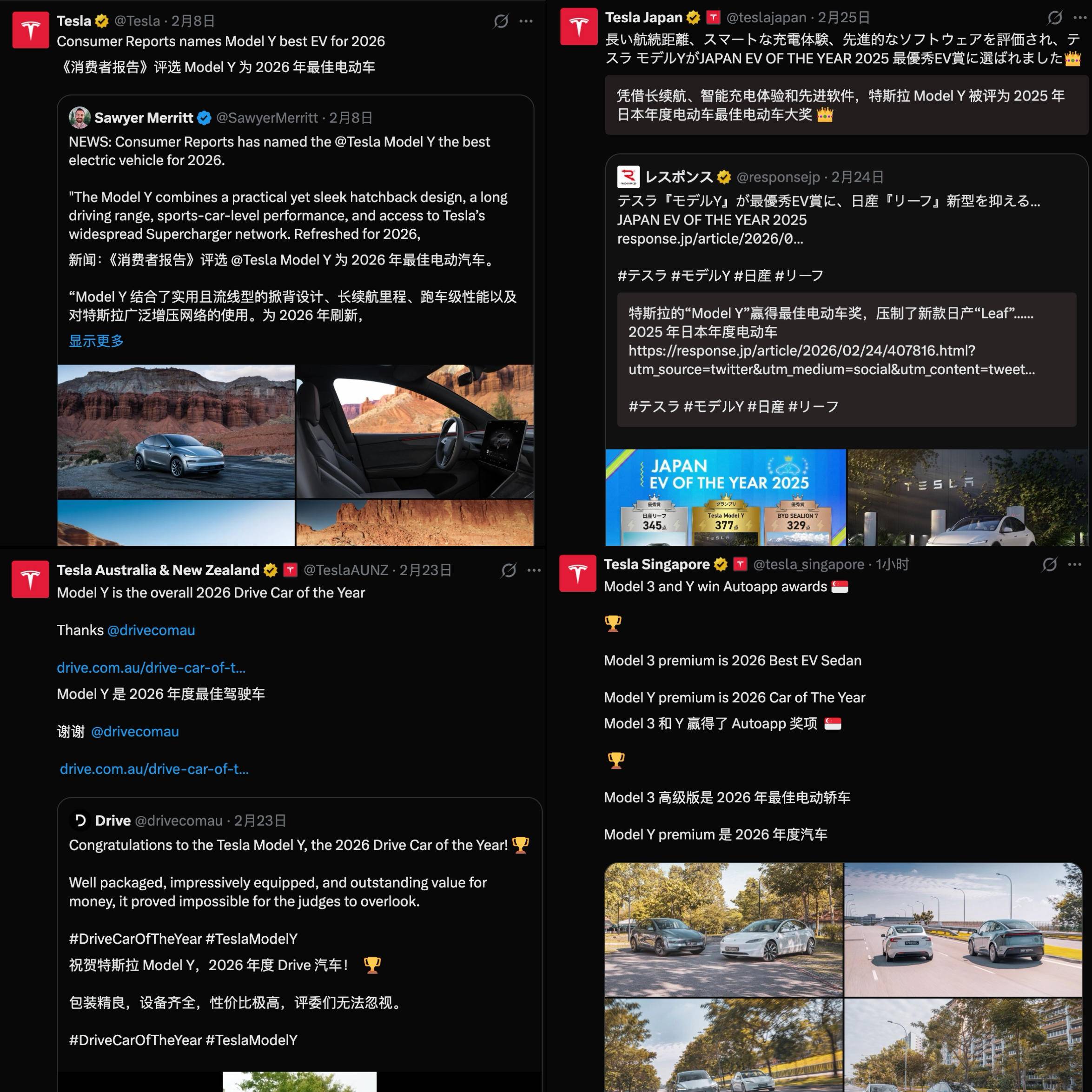 特斯拉的产品硬实力获得全球权威机构广泛认可。得益于优秀的三电系统、便捷的充电体验及常用常新的智能软件,Model Y在权威杂志《消费者报告》“2026年度十大最佳车型”榜单中获评“最佳电动车”,还在澳大利亚、新西兰、日本分别斩获“年度最佳驾驶车型”“年度电动车”“2025年度最佳电动车”称号。Model 3表现同样出色,在新加坡被评为“2026年度车型”及“最佳电动轿车”,特斯拉品牌也在菲律宾被TopGearPh评为“年度突破品牌”并获“最佳新技术实施奖”。