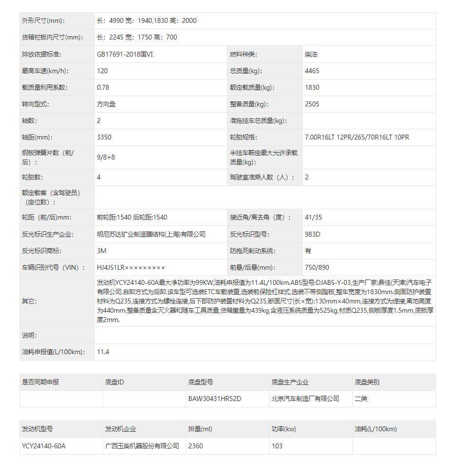 动力配置方面,新车搭载的是来自玉柴的2.4T柴油发动机,最大功率为103千瓦,其申报的百公里油耗值为11.4L。