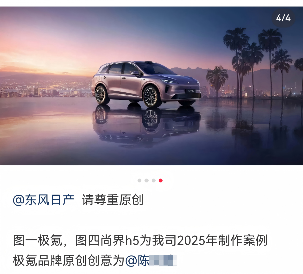 这起事件最令人唏嘘的,从来不是“借鉴”与“抄袭”的边界争议,而是其毫无底线的复制粘贴与敷衍了事的行业态度。原创设计师耗费大量时间、人力与财力打磨的作品,被直接抠掉原有车型、替换上东风日产的产品,便作为官方物料正式出街;连最基础的汽车倒影细节都懒得修改,最终出现车型特征与倒影完全不符的低级失误,这种连“抄都抄不明白”的荒诞,早已突破了创意借鉴的行业底线,沦为了赤裸裸的版权侵权。