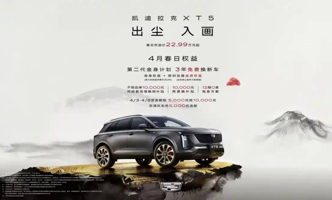 伴随保障权益的升级,凯迪拉克同步推出了多项春日限时购车政策,包括不限品牌10,000元同级最高增换购补贴、12期0息金融方案、5年内10,000元再置换补贴,叠加限时5,000元抵10,000元定金膨胀。在上述权益加持下,凯迪拉克XT5春日限时权益价为22.99万元起。各配置具体价格如下:大都会型春日权益价22.99万元,豪华型25.09万元,尊贵型28.09万元,铂金型32.09万元。上述限时权益需在4月3日至4月30日内完成下定,定金膨胀活动仅限4月3日至4月6日。