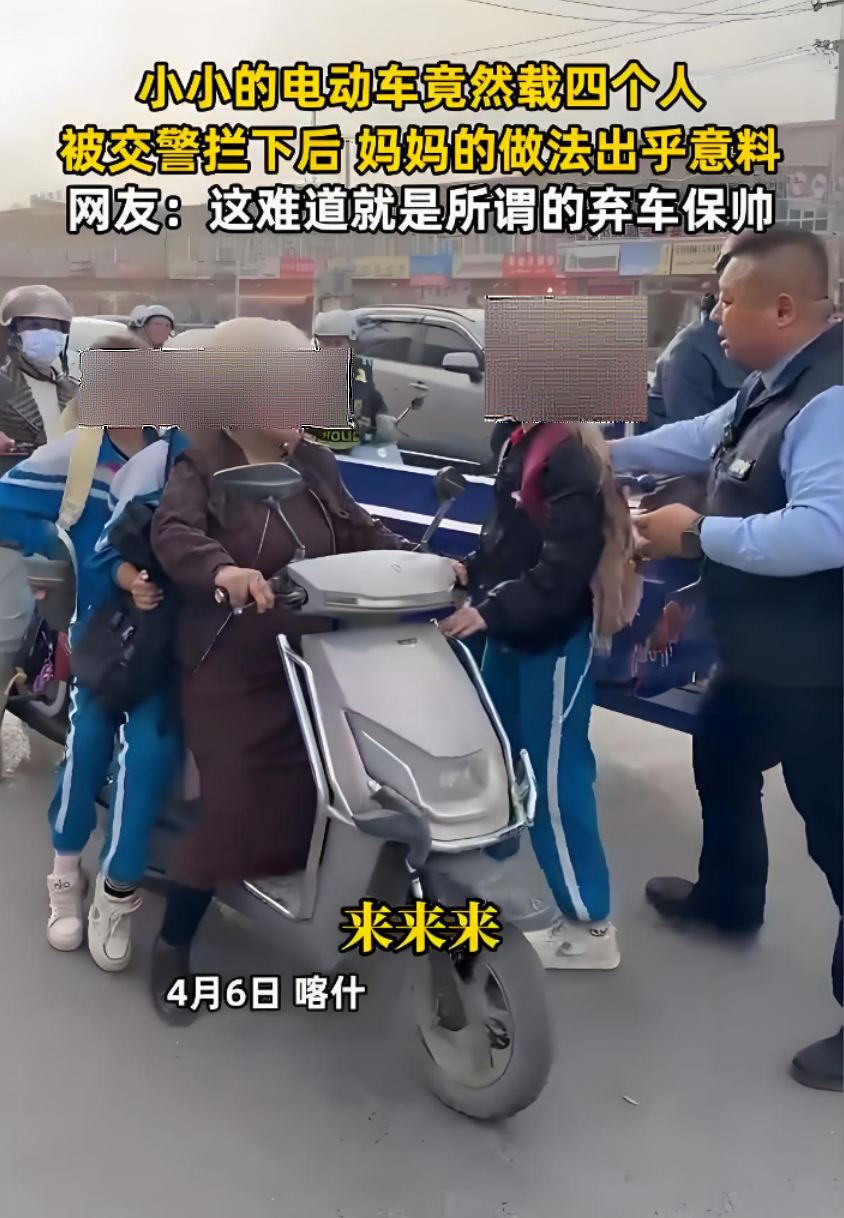 喀什街头,交警看到一辆踏板形制的电动自行车,在这一辆小小的车上竟然挤着四个人!是一位戴着头盔的女士带着三名穿着校服的学生。执勤交警当场拦停,随后把学生们扶下车;而就在这个当口,电动自行车驾驶员竟然骑着电动车跑了。
