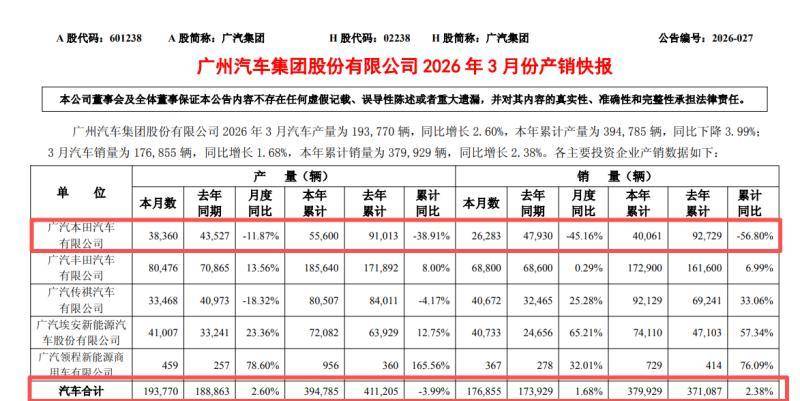 数据显示,2026年一季度广汽本田累计销量仅4万辆,同比大幅下滑56.8%。分月度来看,其销量颓势贯穿整个季度,其中1月销量仅4,558辆,同比暴跌69.86%;2月销量9,220辆,同比下滑68.93%;3月销量虽环比有所回暖至2.6万辆,但同比仍大跌45.16%,依旧处于腰斩区间。
