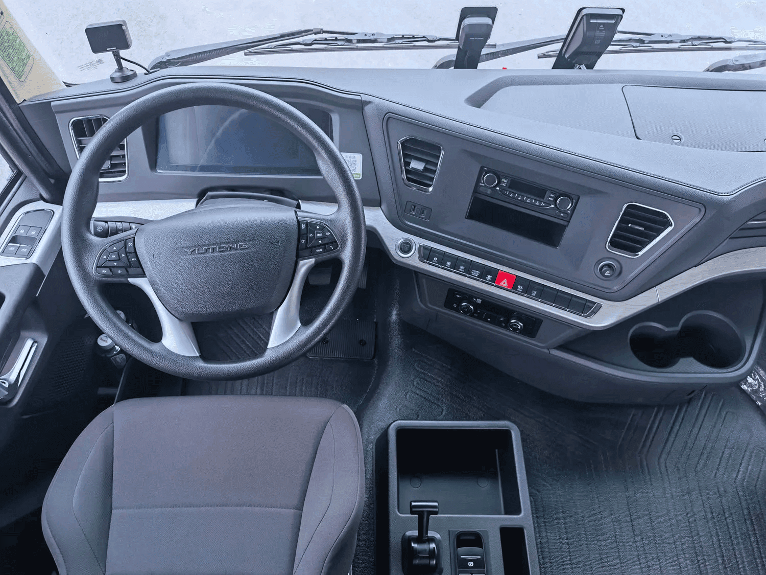 进入车内,宇通T575纯电牵引车配备了多功能方向盘、液晶仪表大屏,并在中控台和主驾右侧分别设计了杯托,方便长时间驾驶时的大量储水需求。