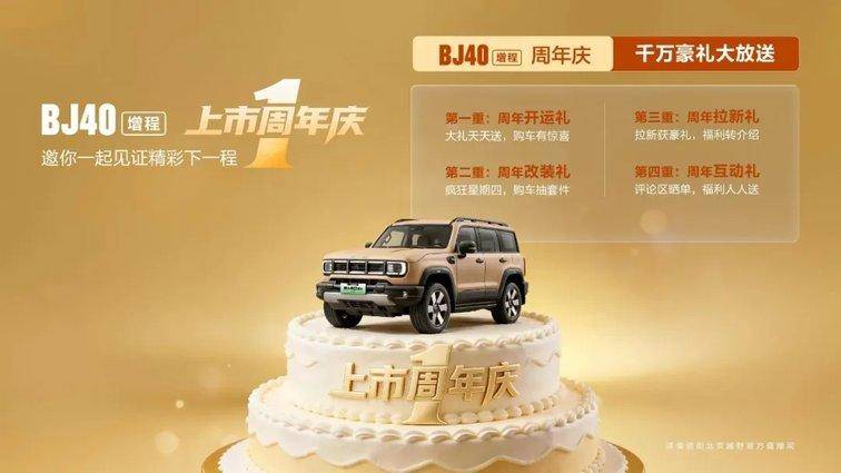 第一重周年开运礼:4月7日-4月23日,北京越野直播间每日抽取5套价值4280元征途尊享哑光漆面膜,购车即享惊喜礼遇;第二重周年改装礼:4月7日-4月20日,购买BJ40增程车型即可自动获得抽奖资格,4月16日、23日两个“疯狂星期四”将在直播间现场抽取5位用户,免费赠送BJ40增程官改套件一套;第三重周年拉新礼:4月7日-4月23日,官方合伙人拉新转介绍BJ40增程车辆达10台,可获官改套件2套或APP等值积分;第四重周年互动礼:4月7日-4月23日,每日抖音官方账号评论区晒4月7日及之后下定的订单,以及第40/80/120层(依此类推)评论者,凭截图私信后台即可领取野乎乎公仔1个。