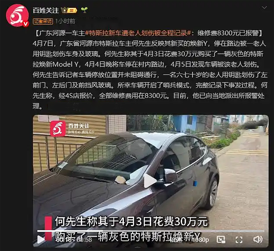 4月3日,广东省河源市的何先生新买了一辆特斯拉Model Y汽车;车辆在4月4日停在村内的路边,停车位置并不影响其他车辆或人员通行;而就在当日,一名六七十岁的老人用钥匙划伤了车辆的左后门、左前门和前挡风玻璃。所幸车辆开启了哨兵模式(即停车后可激活行车记录仪模式),摄像头完整记录下了该老人划车的过程。