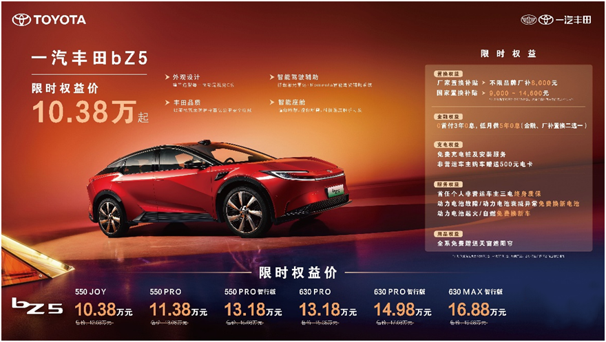 纯电车型bZ5在4月推出限时权益加码,置换权益升级为不限品牌厂补8000元,更可叠加9000-14600元的国家置换补贴,550JOY车型叠加厂补及国补后,限时权益价低至10.38万元。金融权益也是诚意满满,0首付3年0息,低月供5年0息,降低购车门槛(置换、金融二选一)。同时匹配免费充电桩、500元电卡、非营运车主三电终身质保及电池三兜底保障政策,为后续用车提供安心保障。4月购车用户还可免费获赠天窗遮阳帘,舒适加倍。