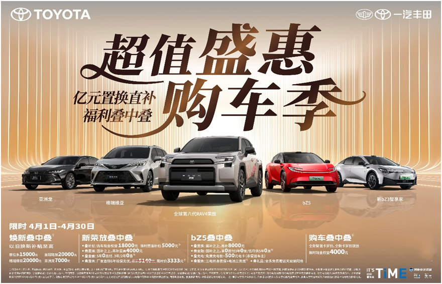 人间四月,春意盎然,正是焕新座驾、奔赴春日的美好时节。一汽丰田超值盛惠购车季热力开启,亿元置换直补覆盖全明星产品矩阵,多重福利叠加、钜惠诚意拉满,以硬核的产品实力、贴心的购车福利,助力用户轻松解锁省油省心的春日出行新体验。