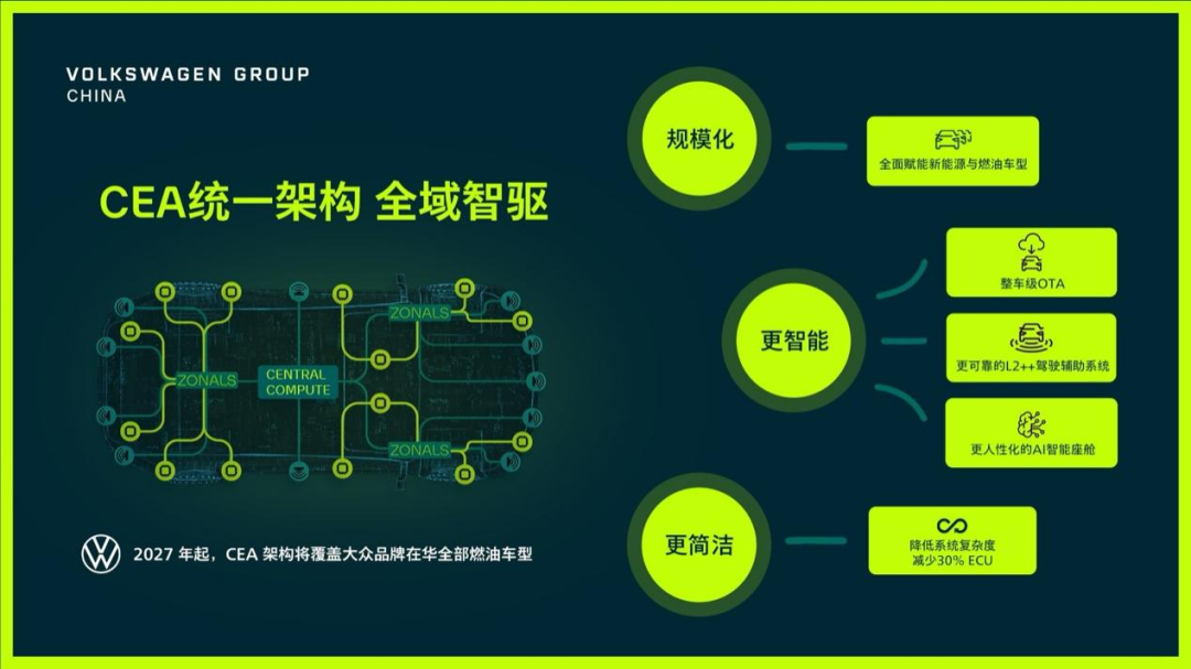 ID.AURA T6首搭的全新CEA电子电气架构,由大众汽车(中国)科技有限公司、CARIAD中国与小鹏汽车联合研发,是大众汽车集团在华首个本土区域控制电子电气架构,从概念提出到量产历时18个月,创下大众集团全新电子电气架构的最快研发速度。