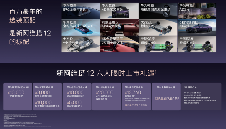 新车全系标配12项百万豪车顶配:华为乾崑ADS 4.1智驾、896线双光路激光雷达、太行分布式电驱、35.4英寸4K屏、25扬英国之宝音响、9安全气囊等,一步到位不选装。