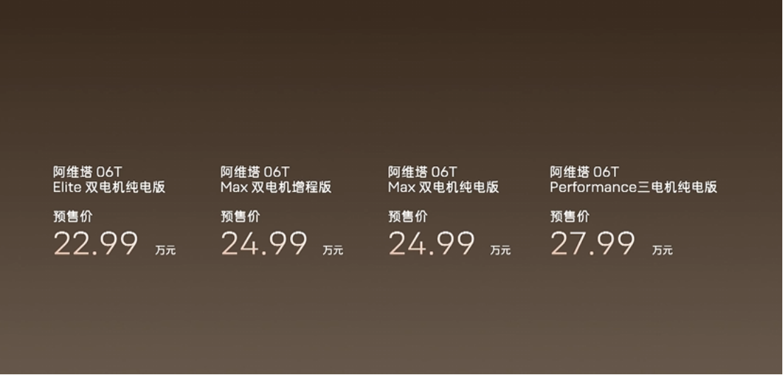 同日开启预售的阿维塔 06T,定位 “智美全场景运动轿车”,共 4 款车型,预售价 22.99 万元 —27.99 万元。下订可享定金膨胀权益及限量联名周边。该车同样标配 896 线激光雷达与 ADS 4 智驾,搭载鸿蒙座舱与 MoLA 大模型,辅以游隼美学、太行分布式电驱、空气悬架 + CDC 系统,兼顾操控、空间与安全,填补主流市场全场景运动轿车空白。