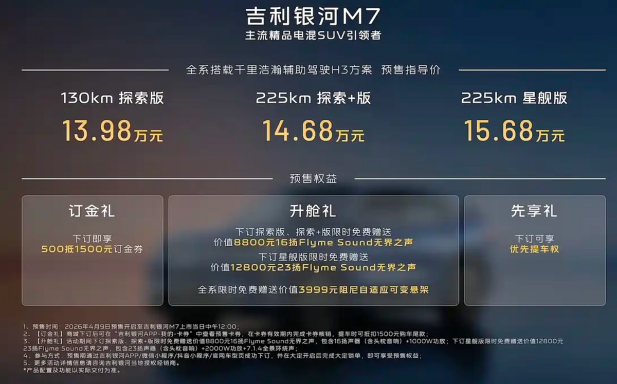4月8日,吉利银河M7预售,价格为:13.98万-15.68万元,超长续航1730km,就问谁看了这个数字不迷糊?