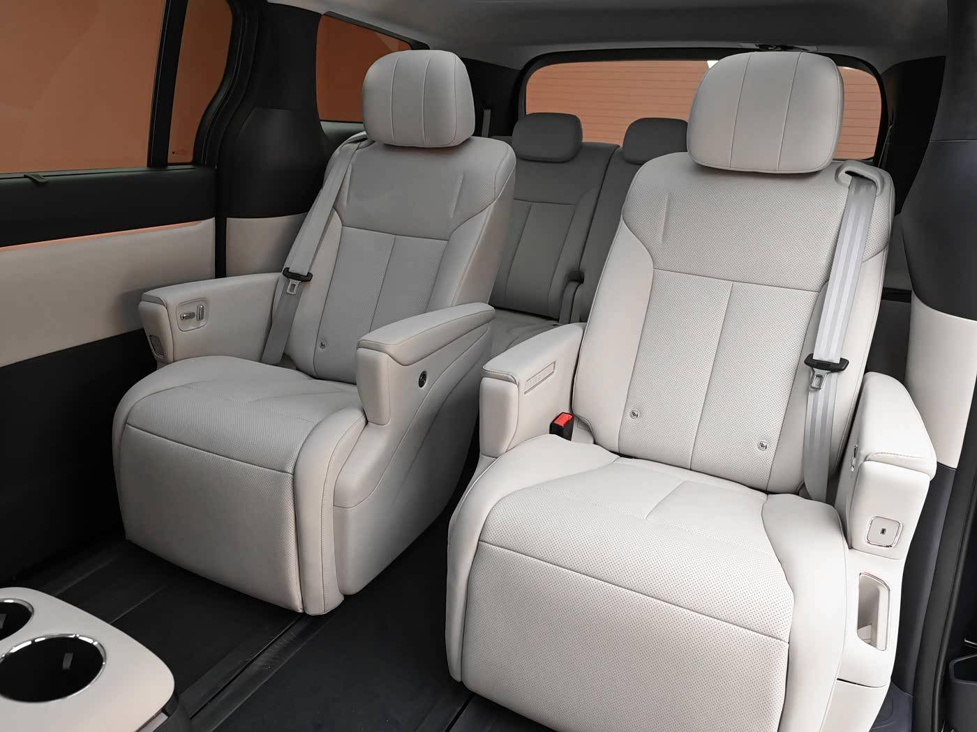车内座椅使用了2+2+3布局,第二排是航空式座椅,带有腿托和双侧座椅扶手,地板平整,带有座椅滑轨。