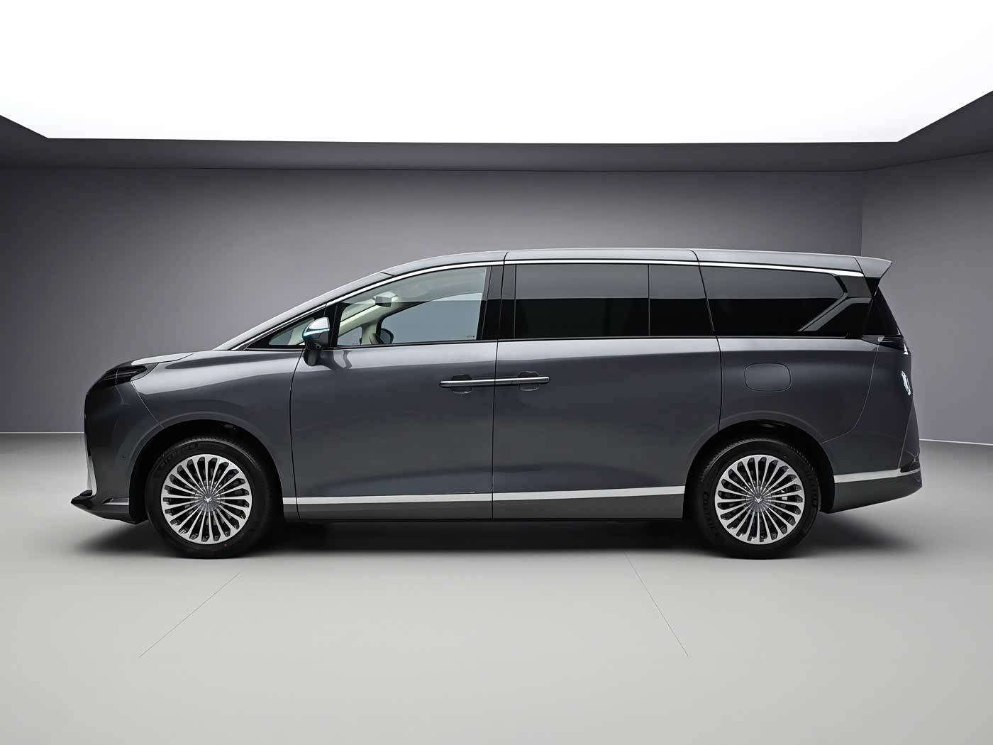 车身侧面部分,A柱带有固定式三角窗,D柱使用了不规则的造型,腰线前部温润,后部是隆起的折角造型,双侧滑门使用了隐藏式的滑轨设计,车身下部带有贯穿下包围的镀铬装饰。