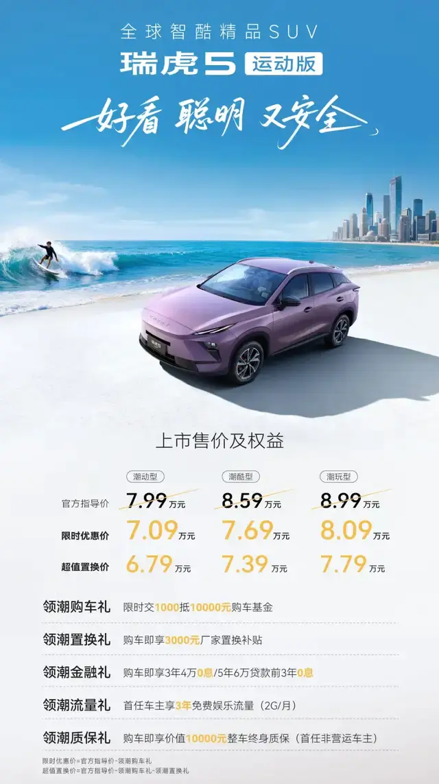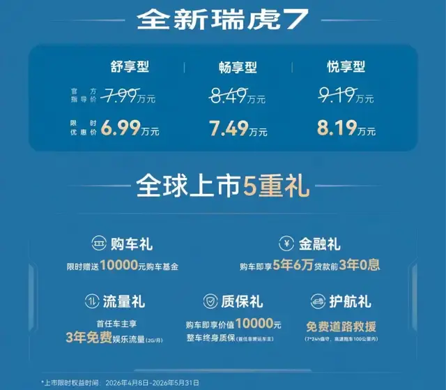 4月8日,奇瑞瑞虎家族瑞虎5运动版、全新瑞虎7/7L三款新车正式上市。三车均主打7-10万级SUV市场,瑞虎5运动版共推出3款车型,官方指导价7.99-8.99万元,可享受1000抵10000元购车基金、至高3000元置换补贴等5重上市礼;全新瑞虎7共推出3款车型,官方指导价7.99-9.19万元,还可享受限时赠送10000元购车基金等5重上市礼;瑞虎7L共推出4款车型,官方指导价8.59-10.69万元,可享受1000元抵8000元购车基金、至高10000元置换补贴等七重上市礼。
