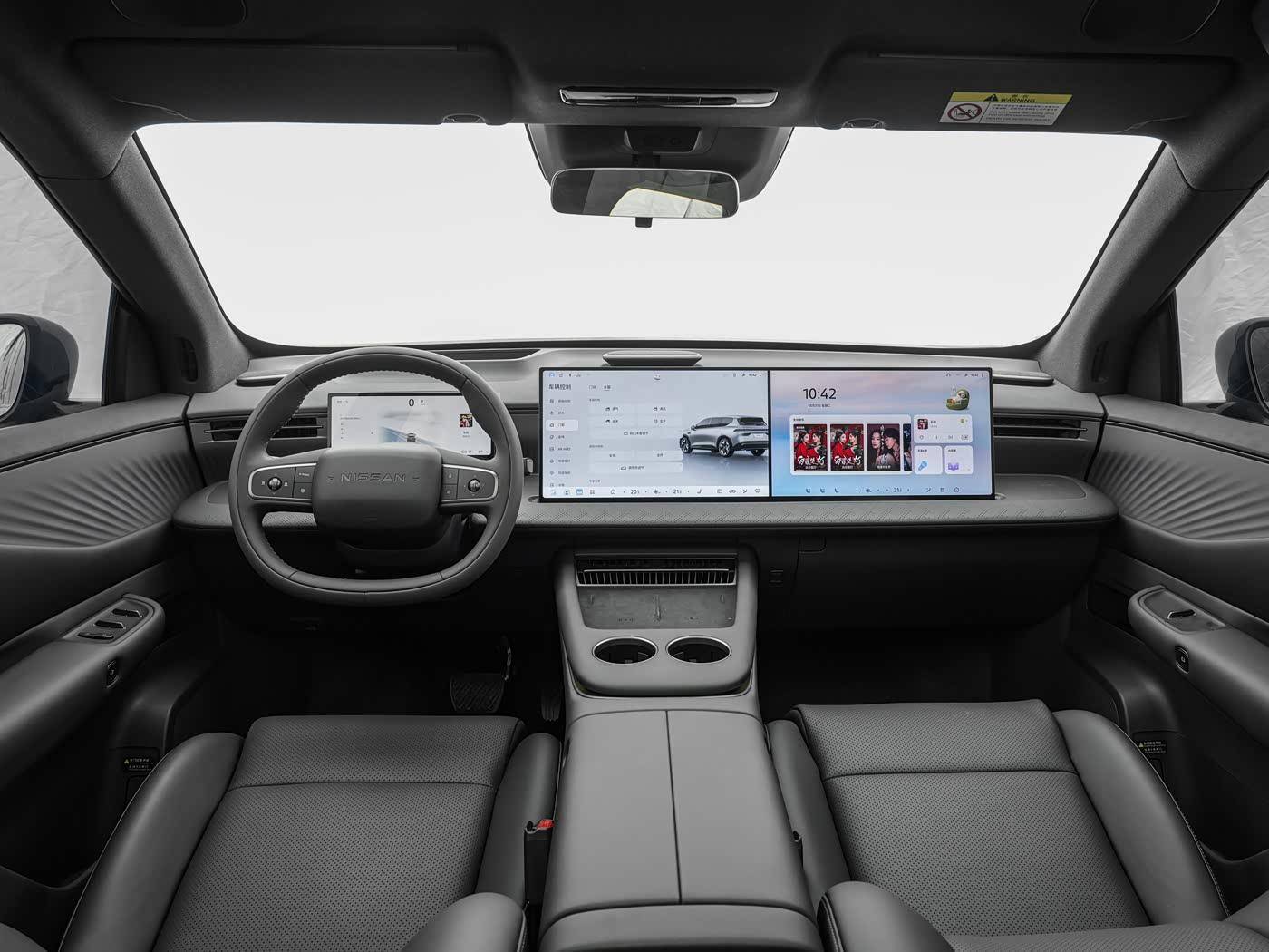 内饰是笔者觉得这台新车最有看点的地方之一了,首先它采用了中控屏+副驾娱乐屏的组合,屏幕大小均为15.6英寸,而且是2.5K屏,内置了NISSAN OS 2.0、高通8295P芯片、四音区智能语音,实用性方面完全无需担心。考虑到潜在用户由油车转变而来,所以新车依旧保留了仪表,尺寸为10.25英寸。至于63英寸的AR HUD,则和NISSAN SOUND 25扬声器一起需要选装,限时价格7000元。配色方面,新车拥有米白和雅黑,两个配色均免费。