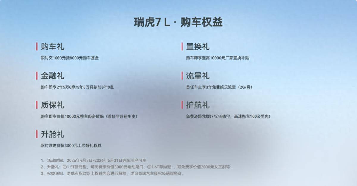 瑞虎7L以“L”级价值进阶,依托全球超百万用户口碑背书,真正实现“全球品质,国民定价”。新车官方指导价8.59万元起,现在下订可享1000抵8000的限时购车礼,同时还可以享受至高1万元置换补贴,此外还有:金融、流量、质保、护航、升舱礼等,让豪华与精品真正回归大众。