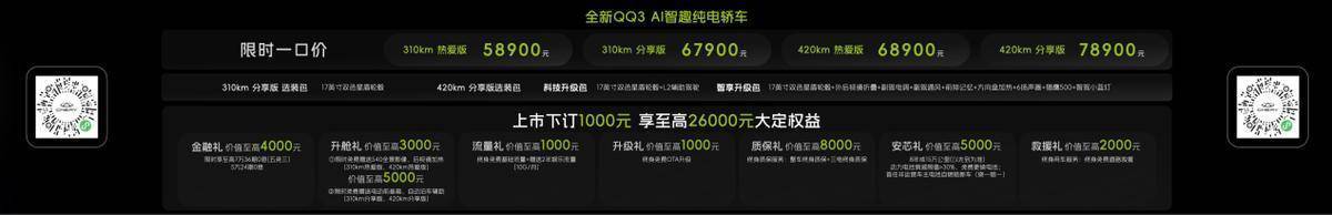 与瑞虎7L同台亮相的,还有一代“国民神车”全新QQ3。新车此前已斩获盲订超6万台、预售超4万台的傲人战绩,此次区域上市备受瞩目。全新QQ3推出310km、420km两种续航版本共四款车型,官方上市价5.89万元起。上市期间下订1000元可享至高26000元大定权益,涵盖金融礼(限时享至高7万36期0息(贷款五年前三年还款可免息);5万24期0息)、升舱礼(热爱版免费赠送540全景影像及后视镜加热,分享版赠送电动前备箱及自动泊车辅助)、流量礼(终身免费基础流量加赠2年娱乐流量)、升级礼(终身免费OTA升级)、质保礼(整车及三电终身质保)、安芯礼(动力电池衰减超过30%可免费更换电池,首任非营运车主电池自燃赔新车)及救援礼(终身免费道路救援)。