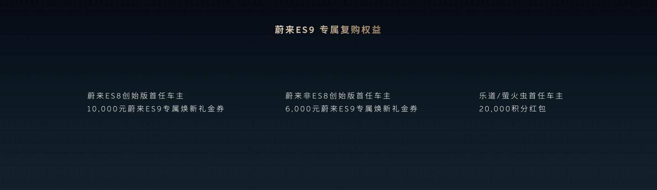 从2026年4月9日(含)起至正式上市发布前,预订蔚来ES9的用户,将享受限时预订权益,支付5,000元预订金,可抵扣10,000元购车款。蔚来还为老用户提供了ES9的专属复购礼遇:蔚来ES8创始版首任车主可享10,000元ES9专属焕新礼金券,蔚来非ES8创始版首任车主可享6,000元ES9专属焕新礼金券;乐道、萤火虫首任车主每人可享 2 万复购积分红包。