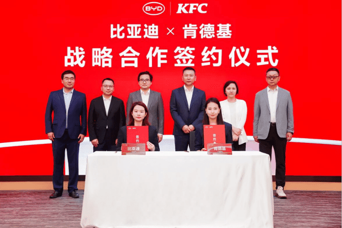 这份便捷体验的背后,是两大行业巨头的强强联合。4月8日,比亚迪与肯德基在深圳比亚迪全球总部正式签署战略合作协议,双方整合新能源汽车与餐饮零售领域核心优势,围绕闪充技术、智能座舱与车速取服务展开全链路深度协同。双方核心管理层均出席签约仪式,见证这一全新合作的启动。