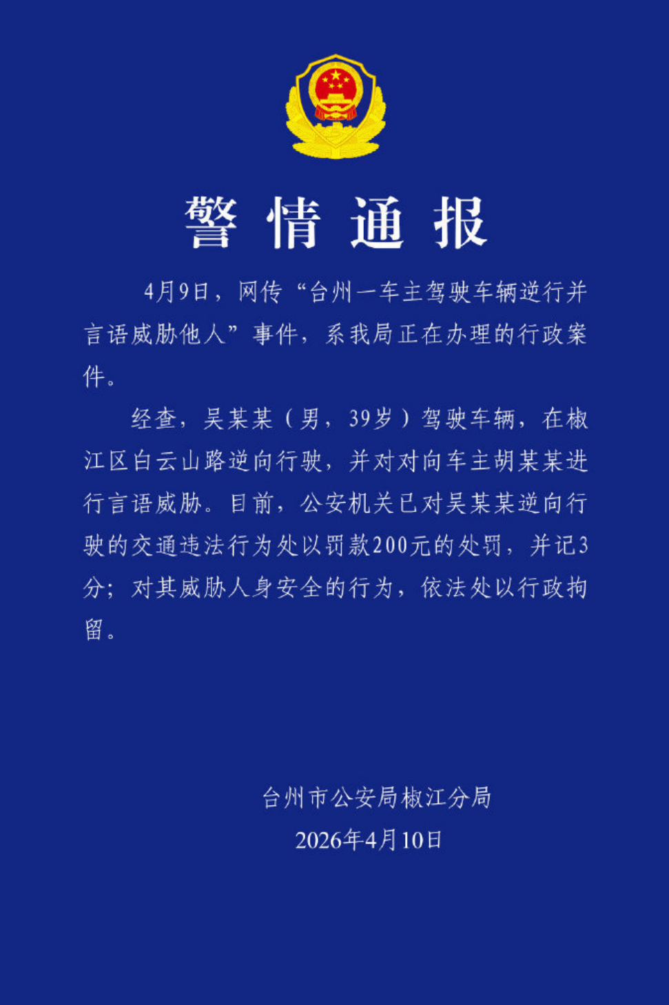 公安机关对保时捷司机吴某某逆向行驶的交通违法行为作出处罚之后,同时对其威胁对方司机人身安全的行为作出依法行政拘留的处罚!吴某某,男,39岁,对方车主为胡某某,在警情通报中没有提到胡某某存在过失,处罚结果大快人心。
