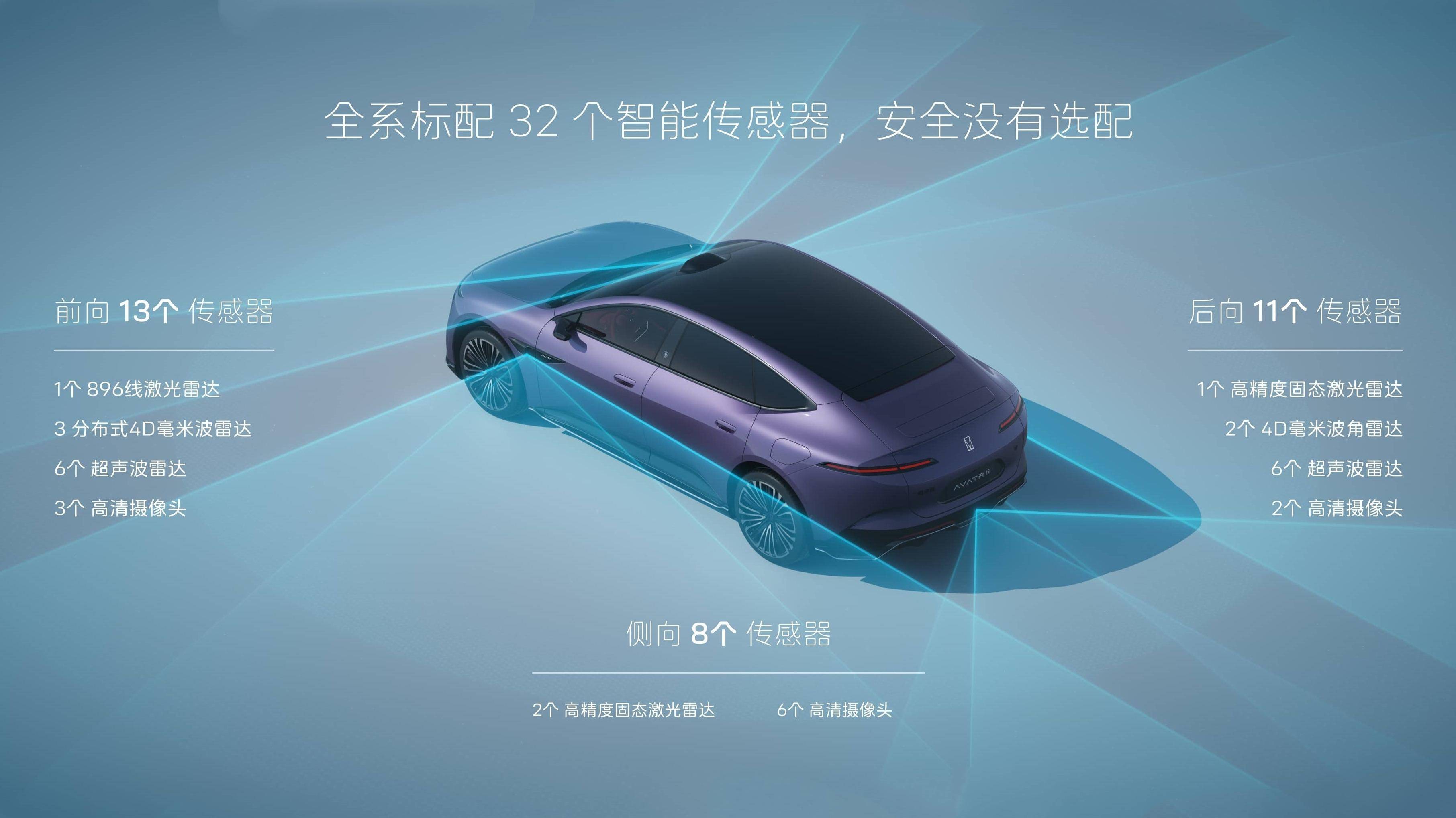 新阿维塔12的厉害之处不止于此。除了这颗896线激光雷达,它身上还装了31个智能传感器,如3颗4D毫米波雷达、11个高清摄像头、12个超声波雷达,前后左右360度无死角盯着。