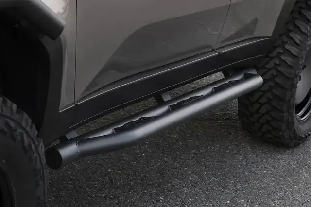 LC250拥有两套外观设计,KUHL RACING选择了更复古的圆灯造型版本,圆形复古大灯搭配黑色蜂窝状格栅,让车头既有野性张力,又不失细节精致度。原厂前包围基础上增加专属前保险杠保护器。直径超过70mm的粗钢管采用“向上翘起”的独特设计,既巧妙避开了原厂包围,又营造出强烈的运动感。底部那块印有“KUHL RACING”标志的钢板,如同一面坚固的盾牌,宣示着它的越野底气。
