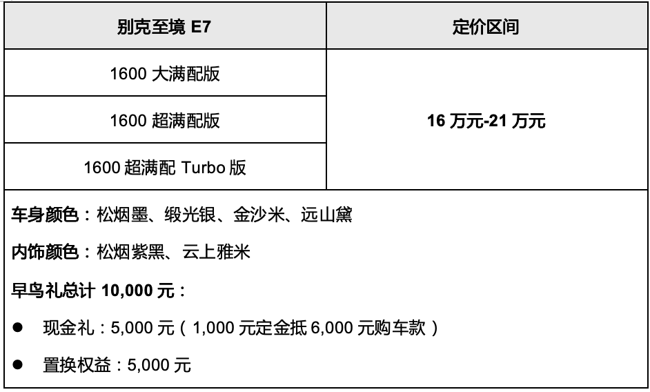 别克至境E7公布三款车型配置,定价区间16万-21万元,即日起至4月21日(含)前下定可享10,000元早鸟礼