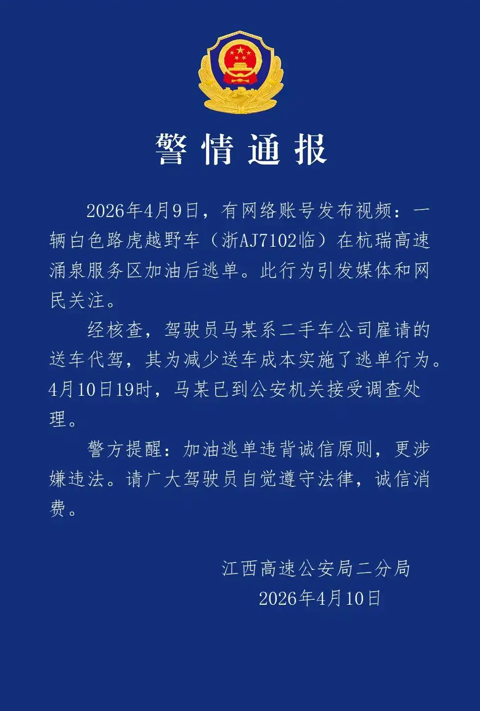 2026年4月9日,有网络账号发布视频,内容为一辆白色路虎SUV(浙A·J7102)在杭瑞高速涌泉服务区加油后逃单。视频引发关注。警方随即对涉事车辆展开定位侦查,不久之后即将涉事男子抓获。
