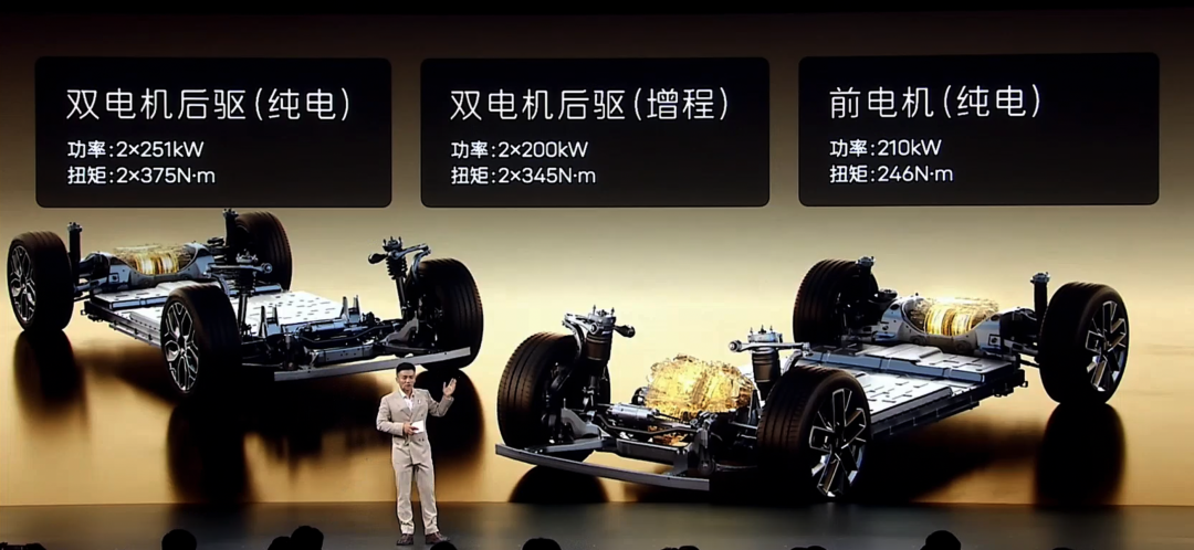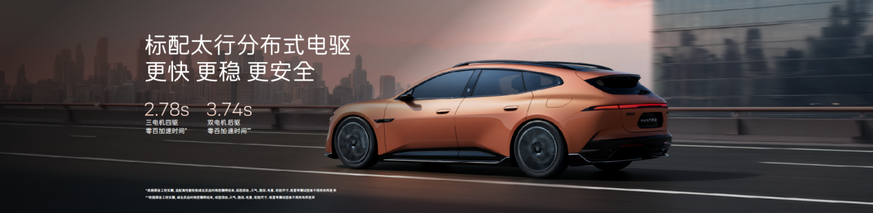 新阿维塔12最大的变化,是彻底告别了单电机版本。全系双电机起步,顶配直接上三电机四驱,前置单电机加后置双电机的组合,总功率达到惊人的712kW(约968马力),零百加速仅需2.71秒,比小米SU7 Max的2.78秒还快一丢丢。