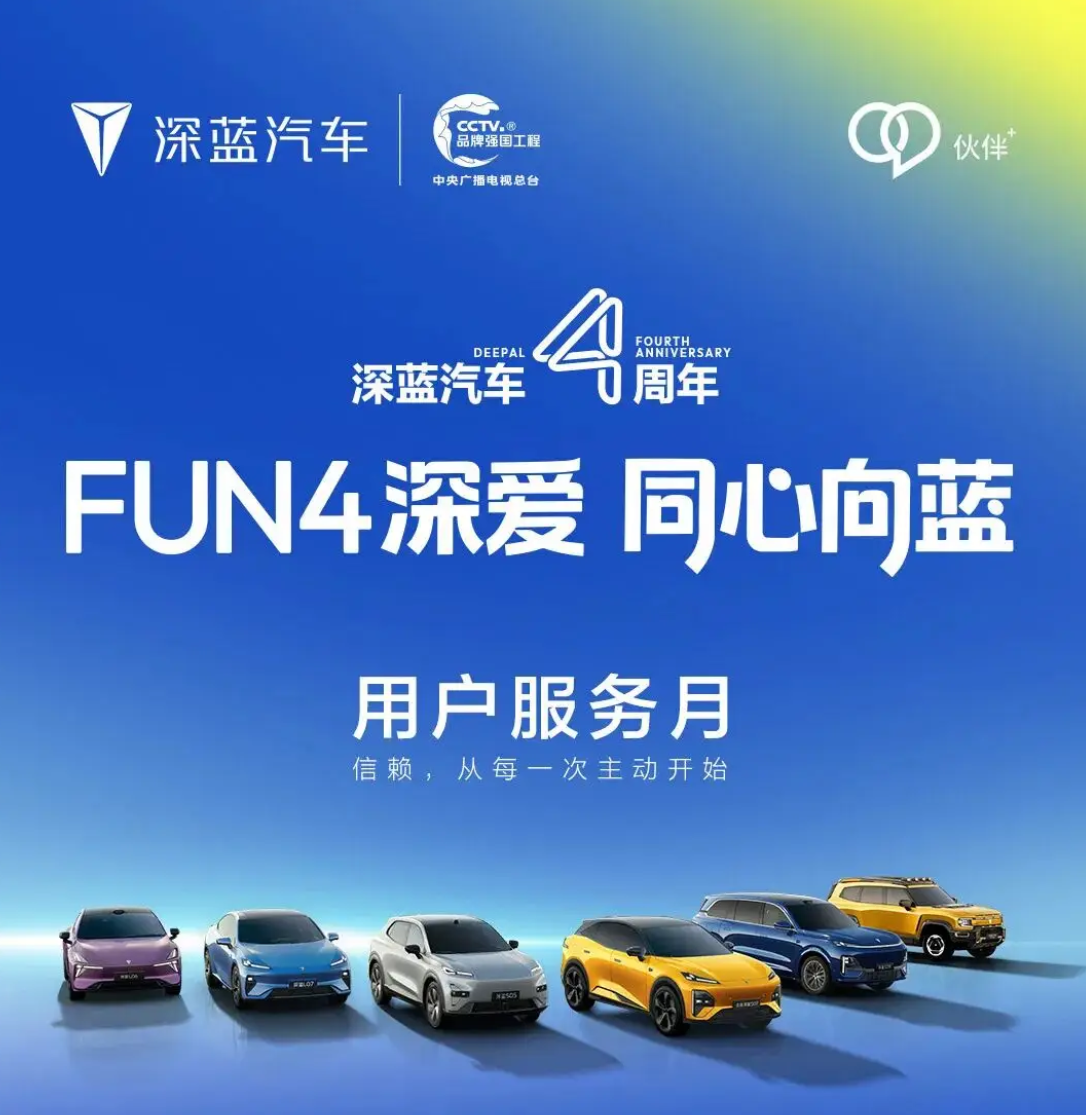 服务层面,4 月深蓝迎来品牌四周年,启动 “五大主动” 用户服务月,推出上门试驾、免费安全检测、24H 紧急救援、百城车主狂欢、商城限时促销等举措,覆盖全拥车旅程。从产品销售到用户运营,深蓝以主动式服务深化口碑,构建品牌与用户的双向奔赴。