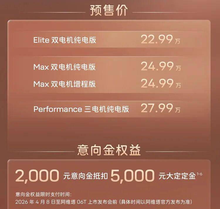 4月8日,阿维塔06T正式开启预售,推出4款车型,预售价22.99-27.99万元。新车提供1.5T增程和纯电双动力形式,并有华为896线激光雷达、鸿蒙座舱HarmonySpace 5加持,将于4月22日正式上市。