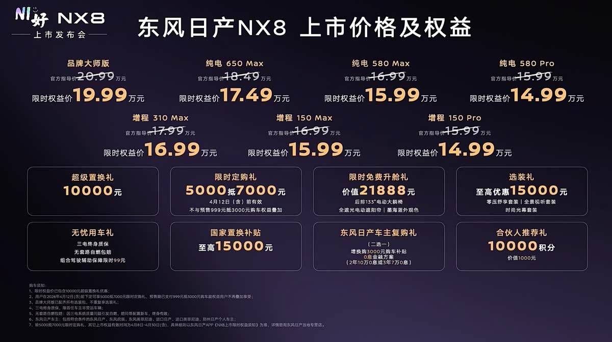 4月8日,东风日产NX8正式上市了,新车共推出2个动力版本,分别是纯电和增程,限时售价区间为14.99-19.99万元,具体价格可看下图。需要注意的是,新车是一台中大型SUV,要知道更贵的理想i6也是这个定位,再加上这个价格,确实让其性价比颇为凸显。在此背景下,很多人都对这台车有了一定的兴趣,那么新车的优缺点又有哪些,它又是否值得买呢?今天就来和大家聊聊这个话题。