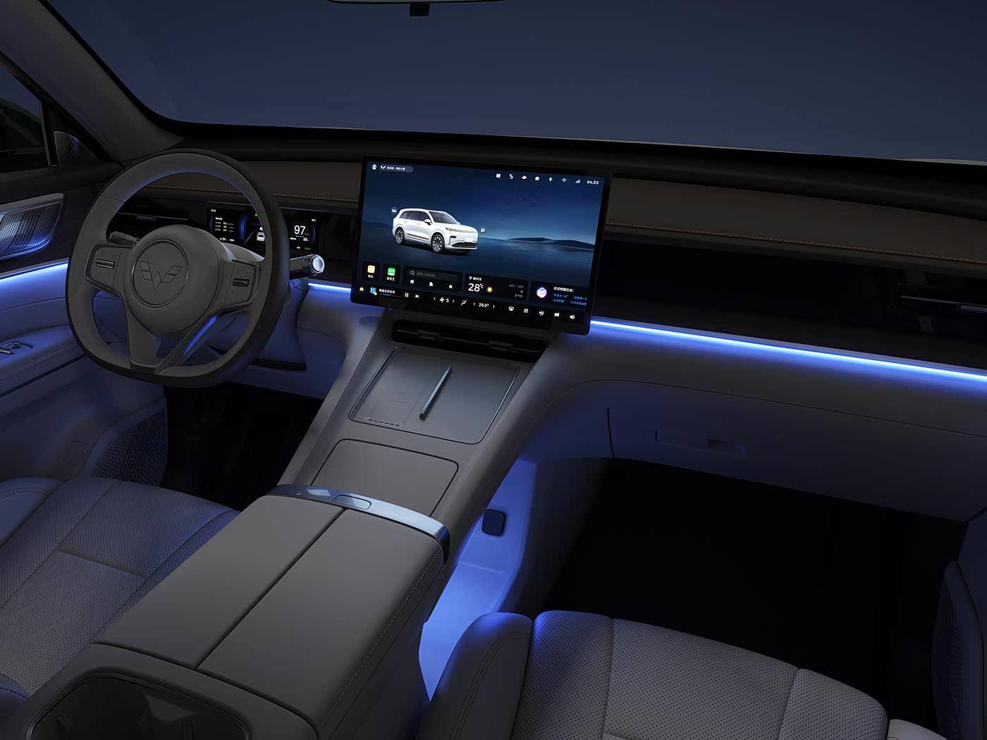 来到车内,新车的内饰就是传统的新能源设计,中控屏尺寸达到了15.6英寸,而且还有8.8英寸液晶仪表,而且仪表是嵌入在中控台中的,搭配贯穿式空调出风口,很好的拉宽了车内视觉效果,而且层次感不俗。新车还提供了256色氛围灯,观感非常不错。