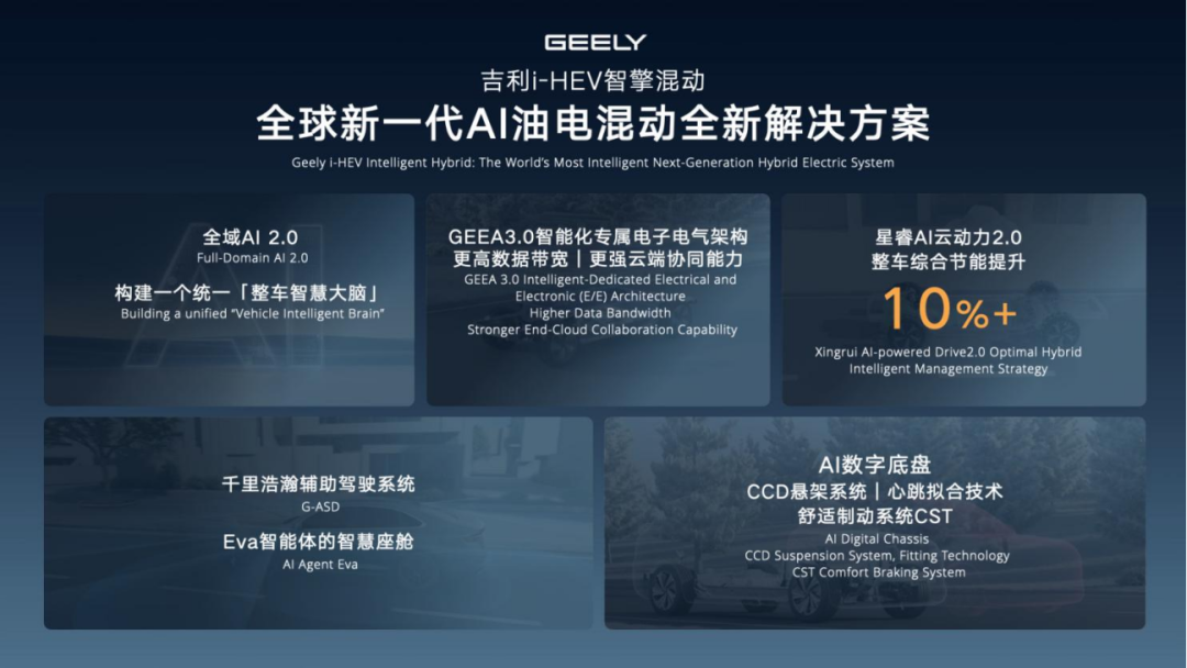 吉利在新闻稿中提到了一个数据:AI能量管理可以带来10%以上的综合节能提升。这10%不是靠更贵的材料或更精密的加工实现的,而是靠算力和算法,从那些传统混动根本无能为力的、不可预测的工况缝隙中“挤”出来的。