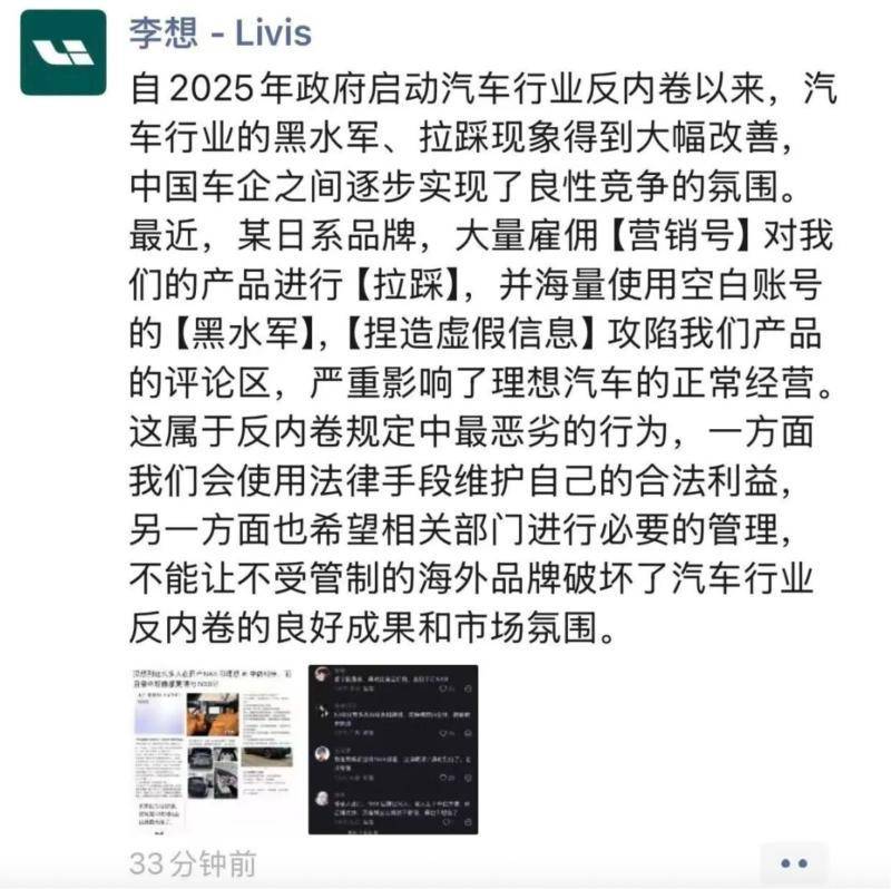 理想汽车法务部紧随其后放出统计:相关贴文以"买车二选一"为统一模板,内容高度同质,IP地址和发布时间异常集中,呈现出明显的组织化痕迹。该日系品牌新能源业务负责人当晚在微博回应,称公司"始终恪守行业规则,倡导良性竞争"。一边是证据链,一边是原则性表态,双方在事实层面并未正面交锋。