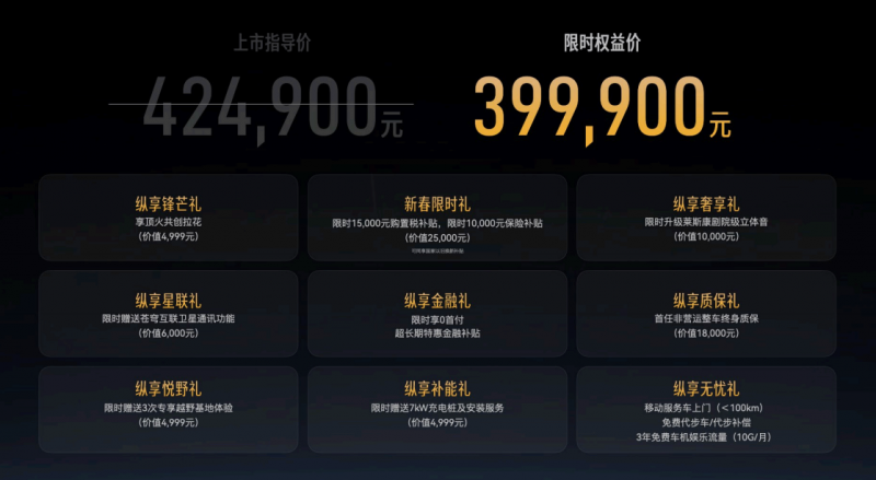 纵横G700顶火鸣镝版以官方定制的硬核实力、全域新能源动力与豪华智能配置,诠释全领域豪华越野SUV的产品价值。新车上市指导价42.49万元,限时权益价39.99万元,同步推出九重上市专属购车权益,涵盖限时订车礼、金融方案、置换补贴及专属质保政策等多重福利,全方位为用户购车、用车保驾护航。订购通道全面开放中,抢先下订锁定专属豪华越野新征程!