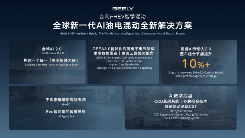 吉利i-HEV智擎混动最核心的竞争力,从来不是单一参数的拔高,是从根本上颠覆了传统混动的技术逻辑,把混动从“机械被动节能”带入“AI主动智能”的全新时代。过去的混动系统,大多依靠固定程序调配动力,只能简单应对常规路况;遇到复杂的拥堵、爬坡、高低温环境,就很难兼顾节能与性能。吉利依托全域AI 2.0技术,给这套系统装上了真正的“智慧大脑”。搭载的星睿AI云动力2.0大模型,不再是简单的数据处理,而是能实时感知车外温度、湿度、海拔,甚至预判用户的行驶路线和驾驶习惯,毫秒级匹配最优油电驱动策略。日常城市通勤时,它能在畅通路段提前储电,拥堵路段优先用电,让发动机始终避开低效运转区间,真正实现越堵越省油,综合节能效果直接提升10%以上。这种贴合用户真实用车场景的智能优化,远比冰冷的技术参数更有价值,也让混动车型第一次拥有了堪比电车的聪明体验,彻底告别了传统混动呆板、滞后的动力调配方式。