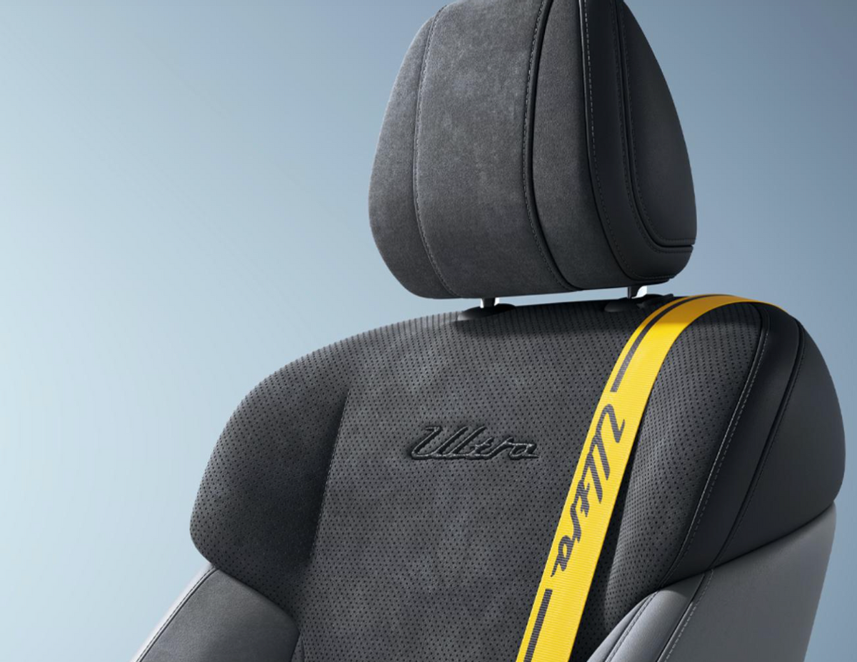 内饰则提供“逐风灰”内饰配色,仿麂皮运动座椅靠背自带专属Ultra字母刺绣,搭配车身同色Ultra印花安全带,点燃你的驾驶热情。