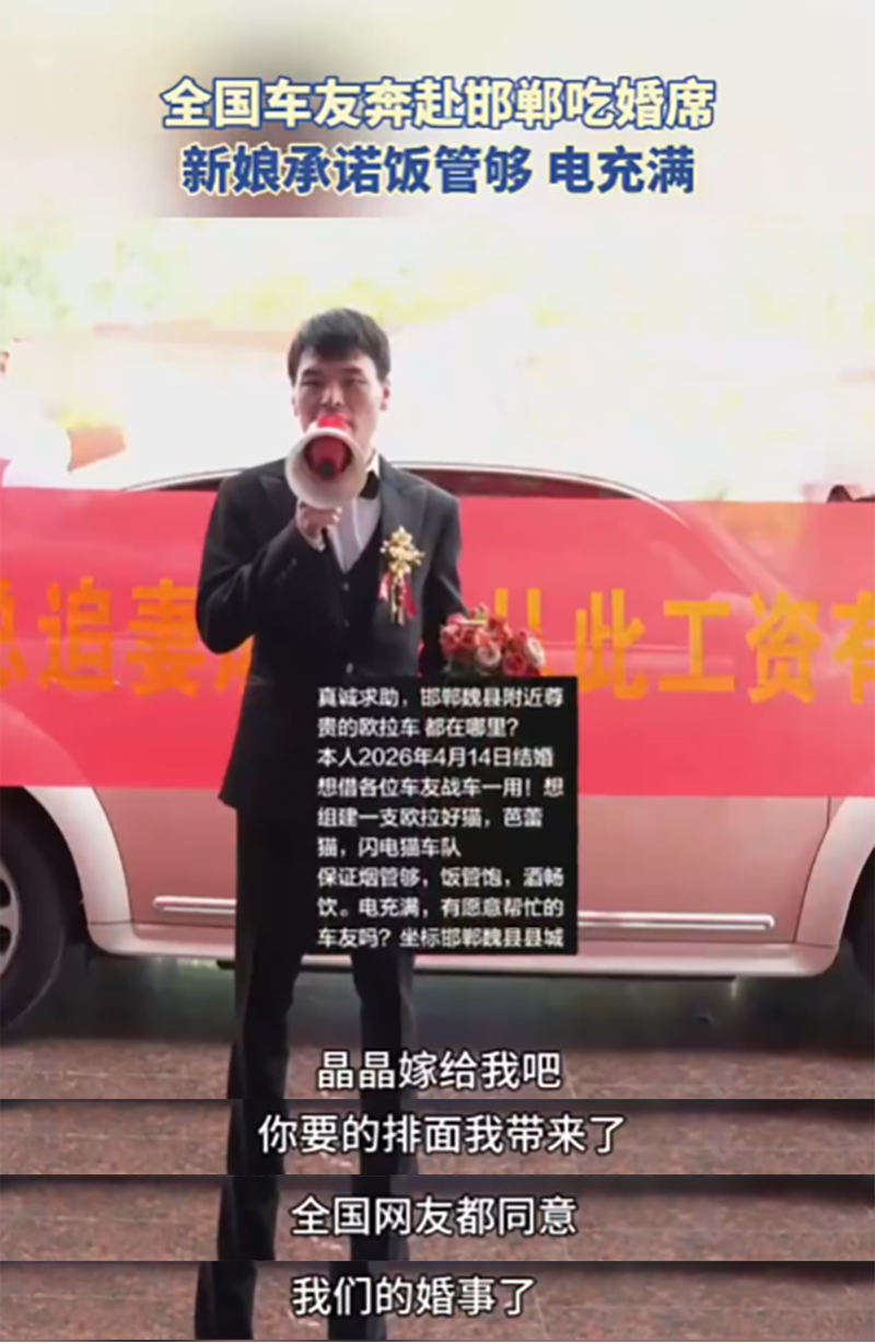 你们在哪儿呀?我2026年4月14日就要结婚了,想借各位的“战车”一用;组建一支由欧拉好猫、芭蕾猫、闪电猫的车队;保证烟管够、饭管饱、酒畅饮,电也给你们充满!有愿意帮忙的车友吗?我在邯郸魏县县城等你们!